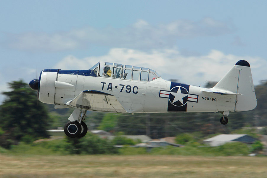 Just like our P-51D, T-6 79C has been operated by California Warbirds in many locations since the early 70's and is currently based in Hollister, CA. Our aircraft, built in 1944 represents one of the more common versions, the AT-6D, in which 4,500 were manufactured. 79C frequents many west coast airshows and helps serve as a new and recurrent trainer for the P-51D.