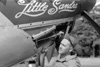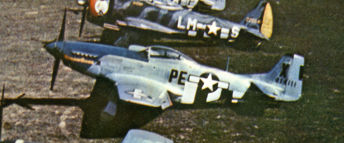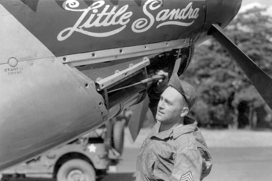 The Colonel's first P-51, a B model was named "StrawBoss", a nickname said to be given to him by his dad. After a gear-up landing accident, StrawBoss was replaced with a fresh P-51D. While the left side of the new mount wore "StrawBoss 2", the right side was painted "Little Sandra", named after crew chief S/Sgt Hubert Robling's daugther.
